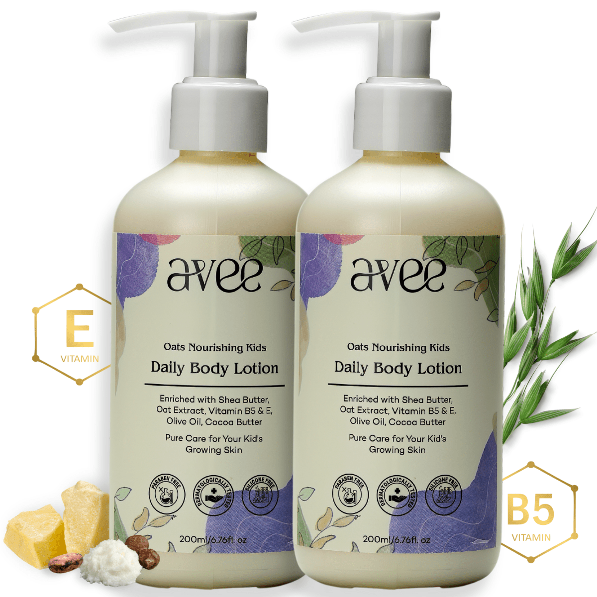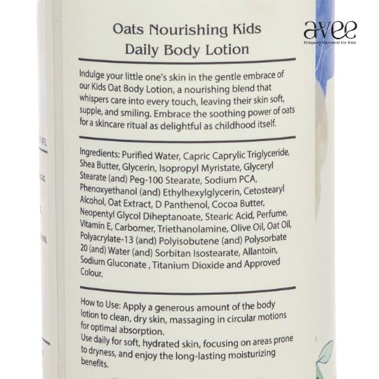 - Avee Kids Body Lotion contains natural ingredients like oats, multivitamins, shea butter, and cocoa butter.